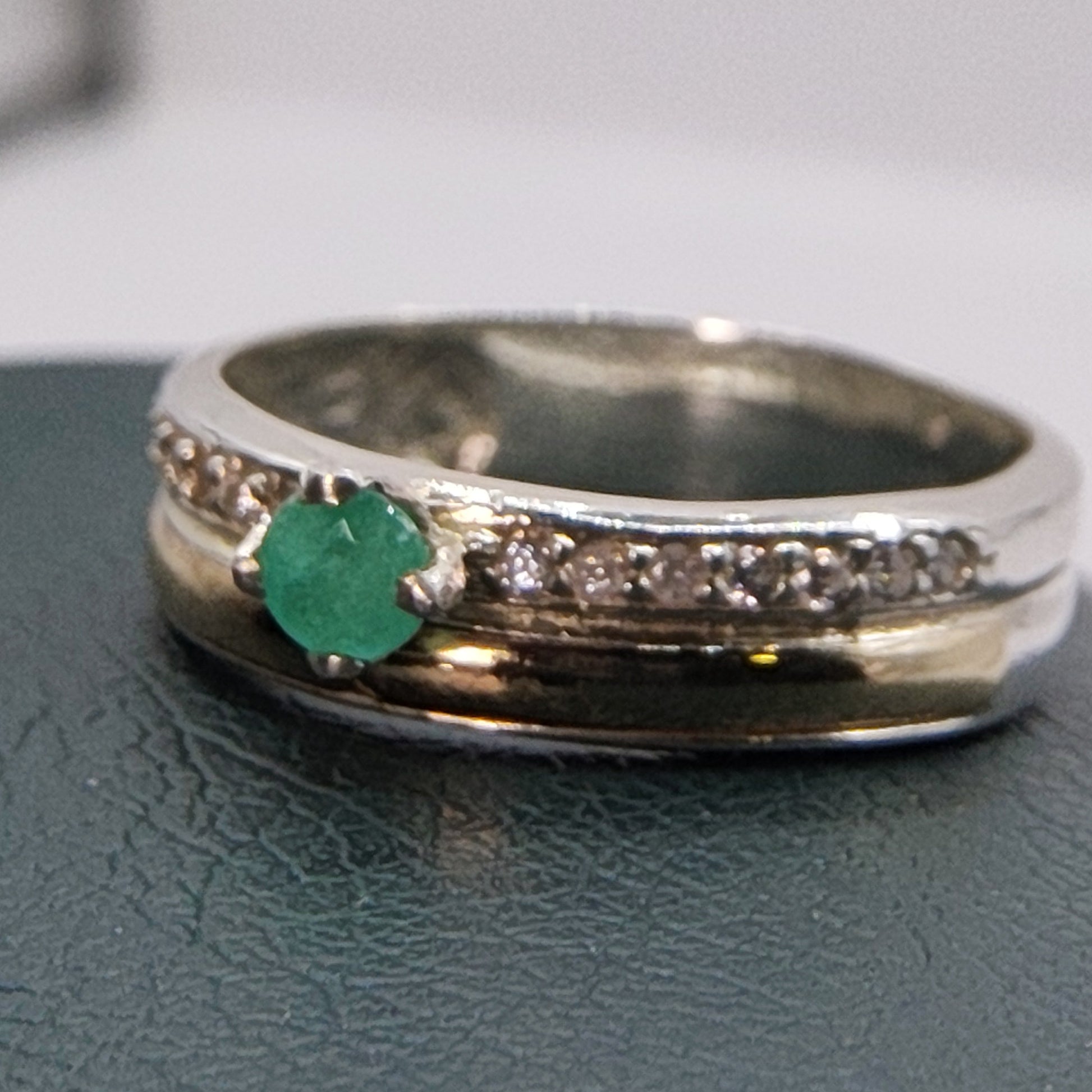 Anillo Dualia, con un diseño que celebra la unión, elaborado en plata ley 925, con un delicado baño de oro 14k en el aro inferior, tiene una esmeralda natural colombiana central y 7 circones blancos a cada lado.