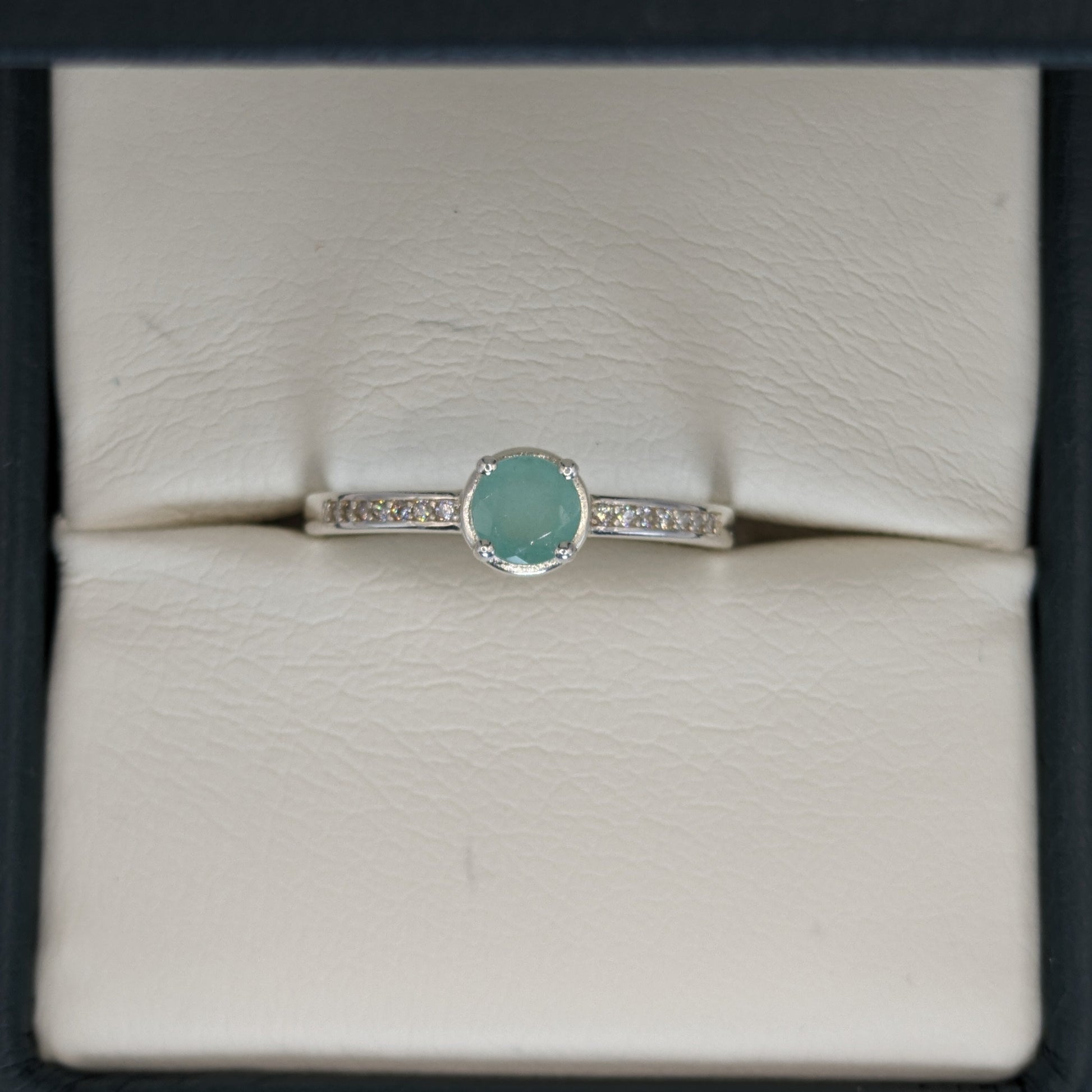 Anillo Verde Luna, un diseño delicado y elegante en plata ley 925, con una esmeralda natural colombiana como protagonista, y circones laterales.